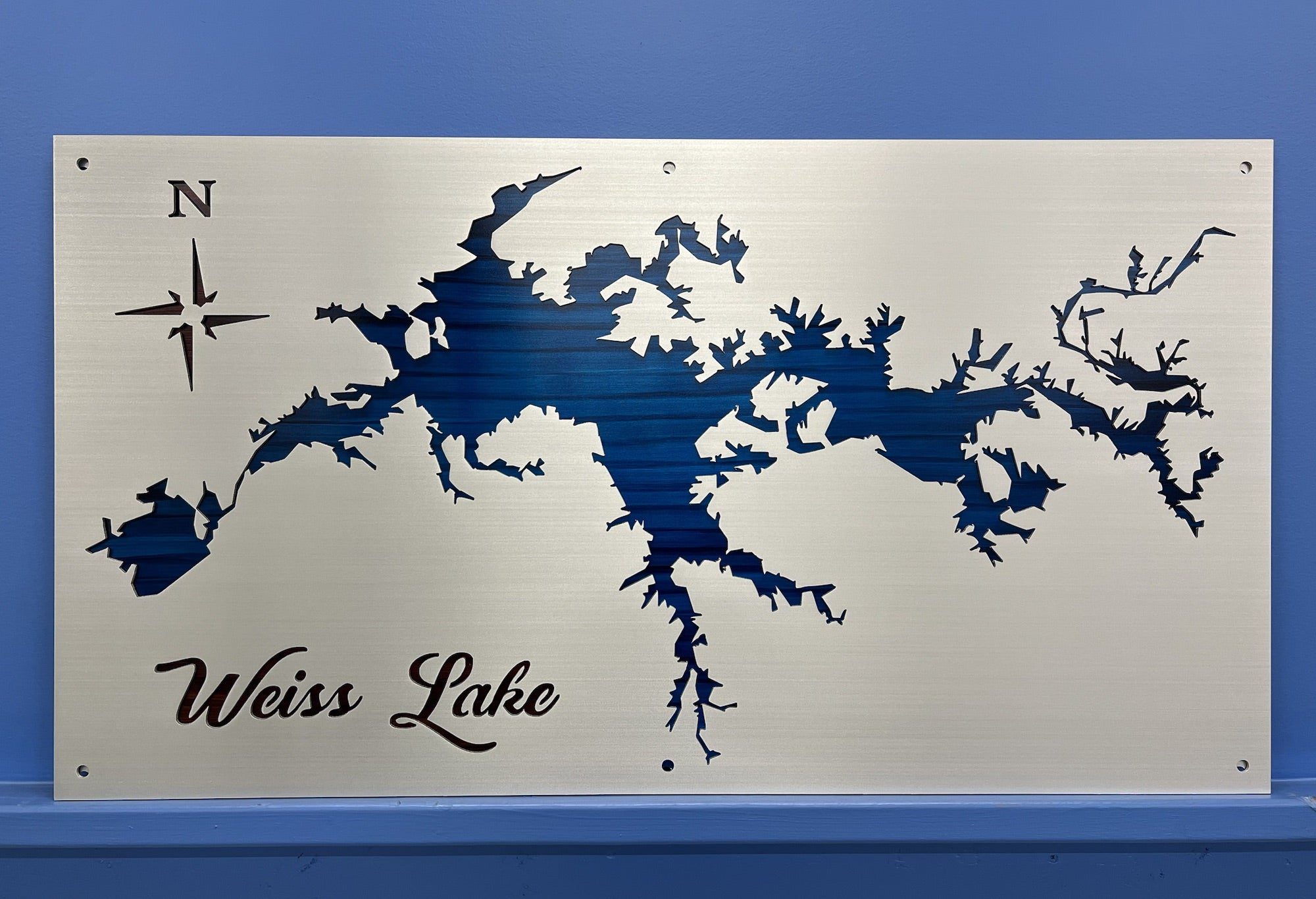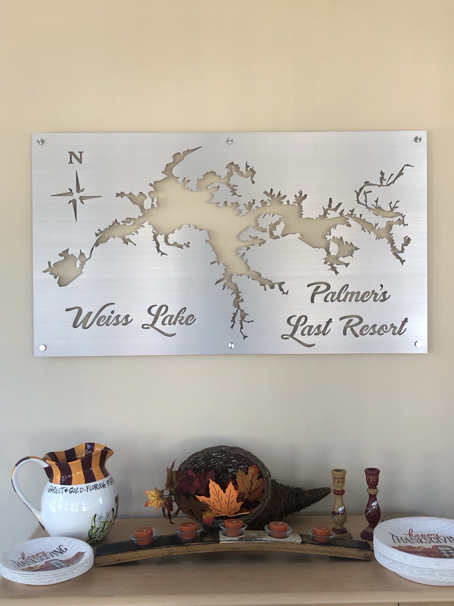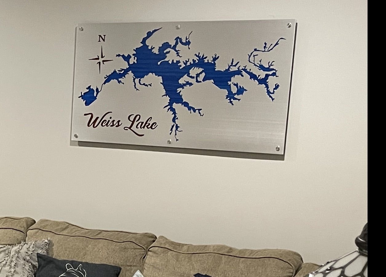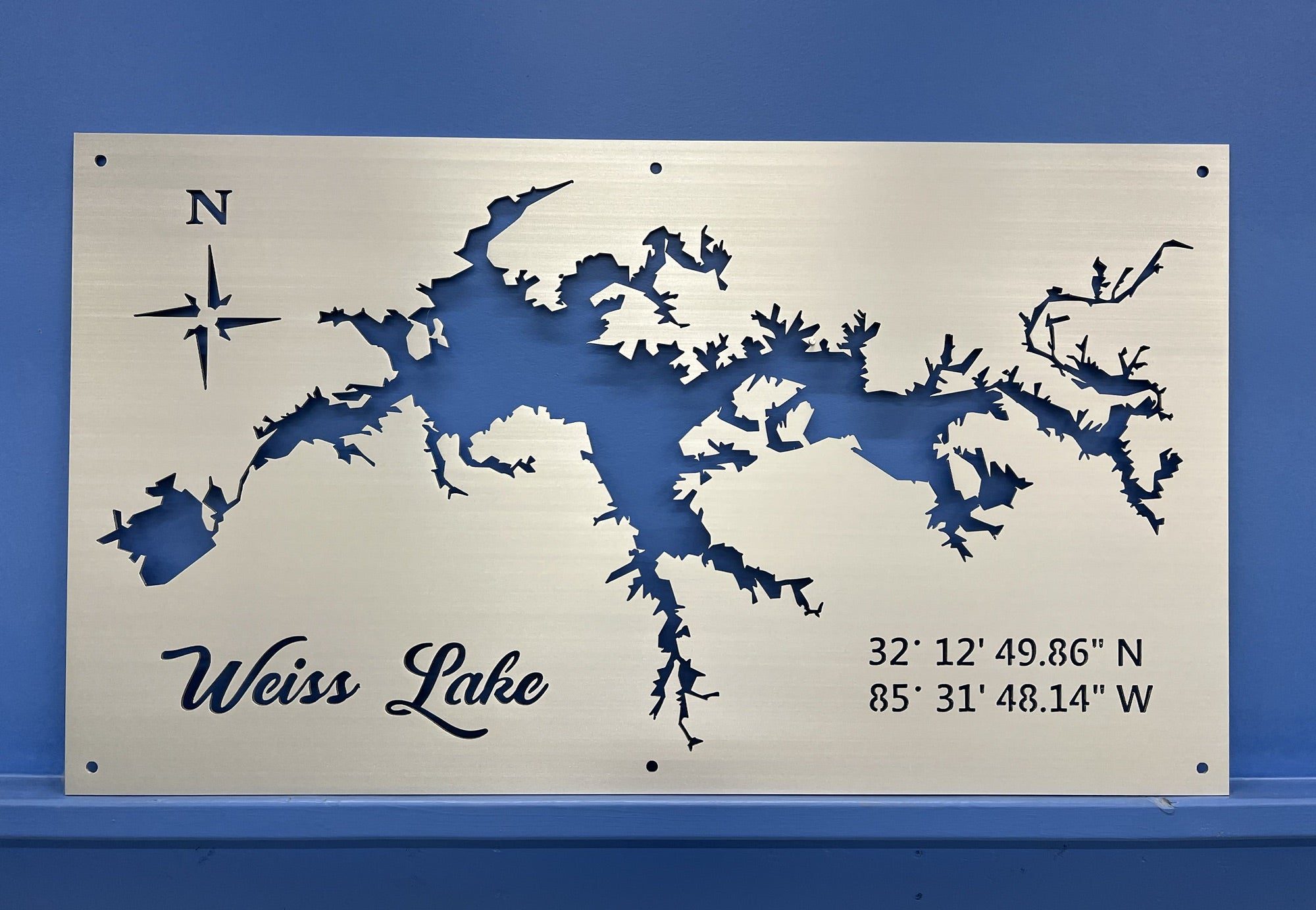 Make a unique statement with our beautifully crafted Weiss Lake map. Each Weiss Lake map is precision-cut from high-quality 1/8″ brushed aluminum, measuring 23″x43″. Mounted with 3/4-inch stainless-steel standoffs, your custom lake map appears to float elegantly off your wall, indoors or outdoors.