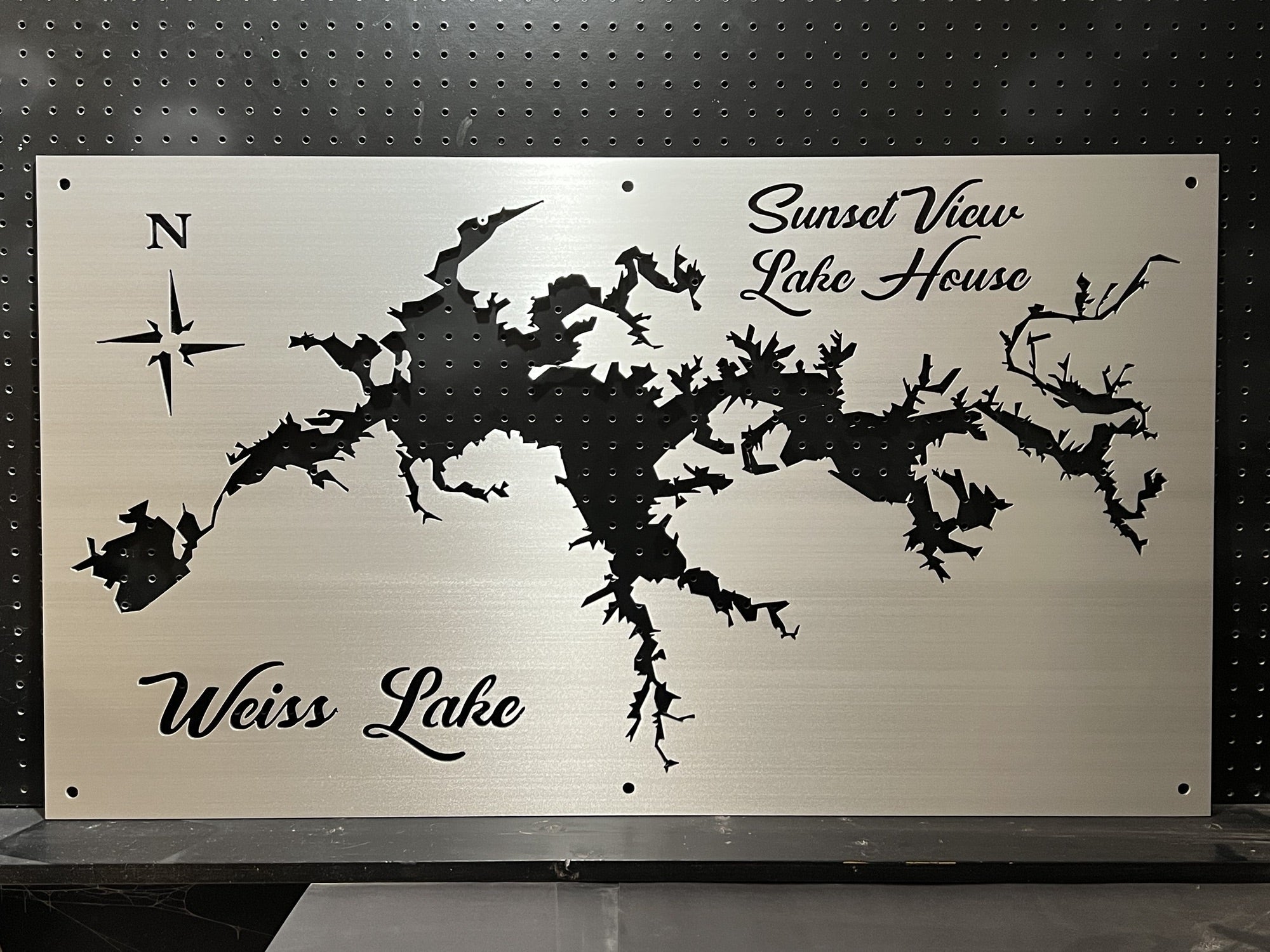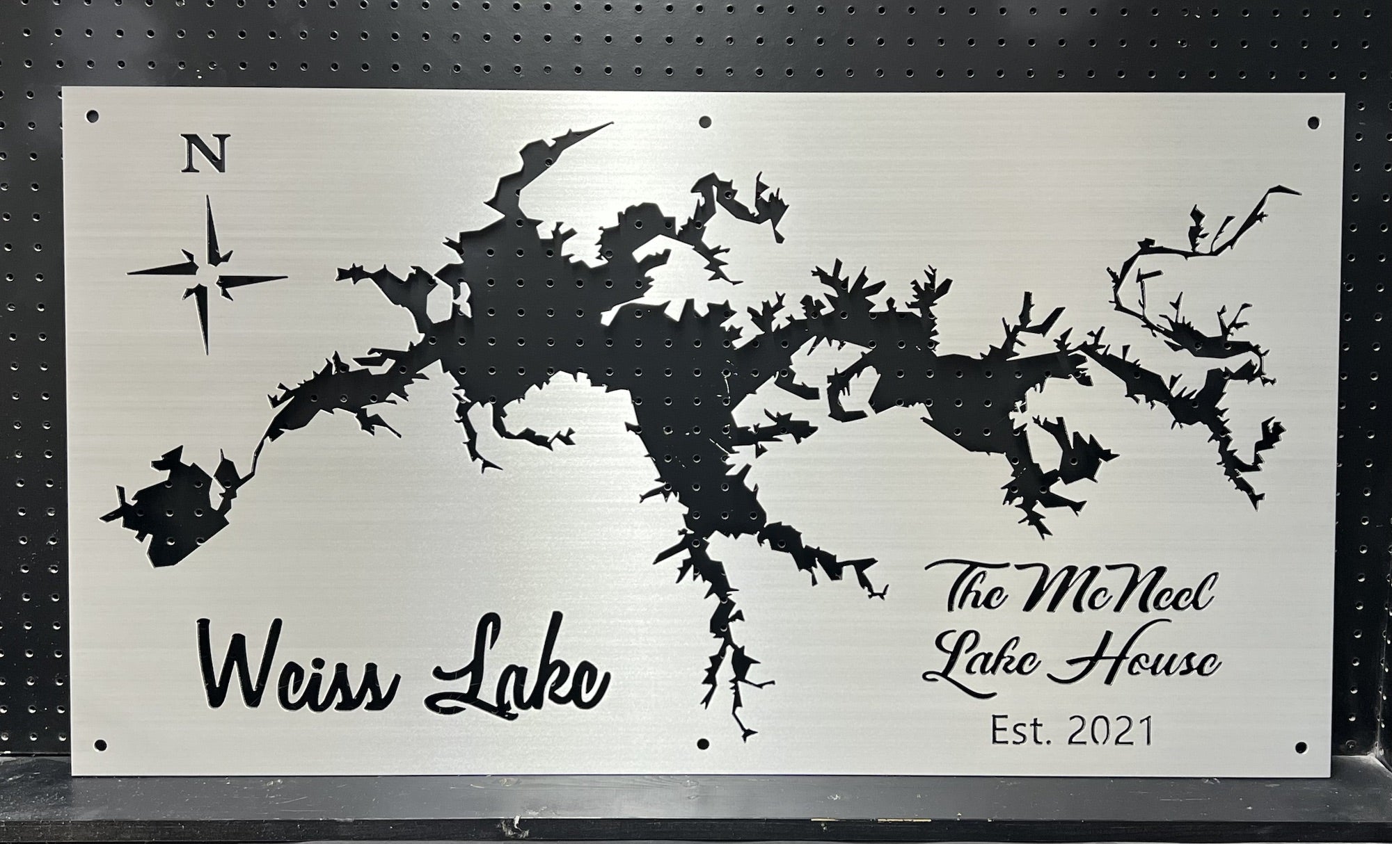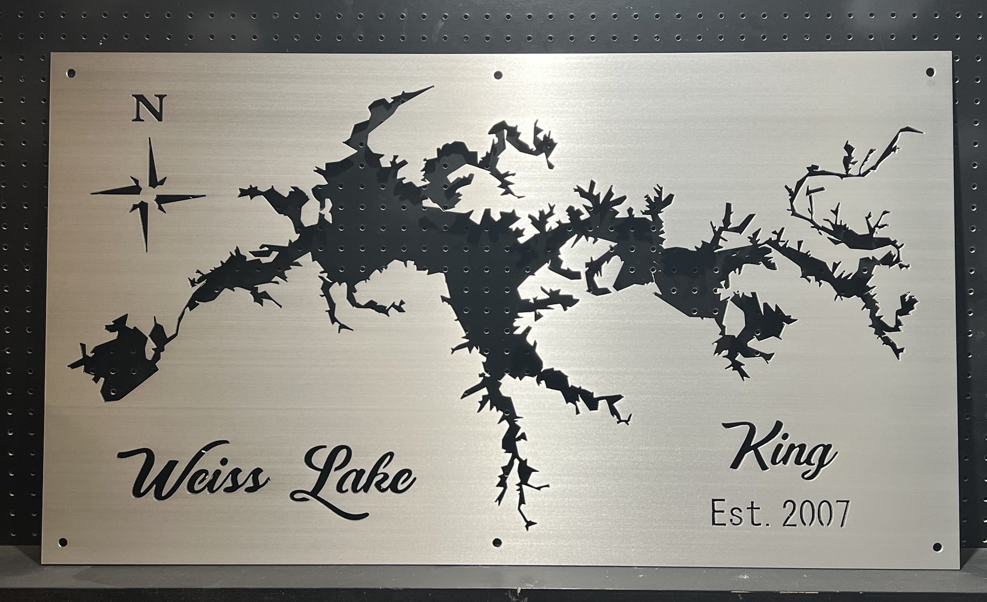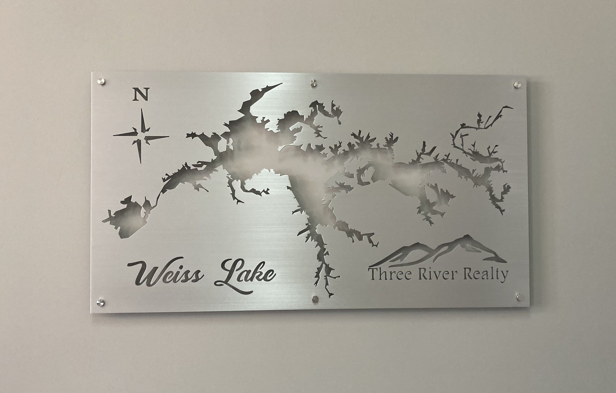 Make a unique statement with our beautifully crafted Weiss Lake map. Each Weiss Lake map is precision-cut from high-quality 1/8″ brushed aluminum, measuring 23″x43″. Mounted with 3/4-inch stainless-steel standoffs, your custom lake map appears to float elegantly off your wall, indoors or outdoors.