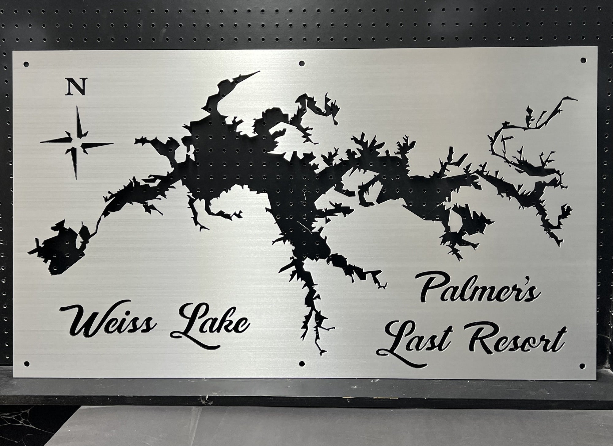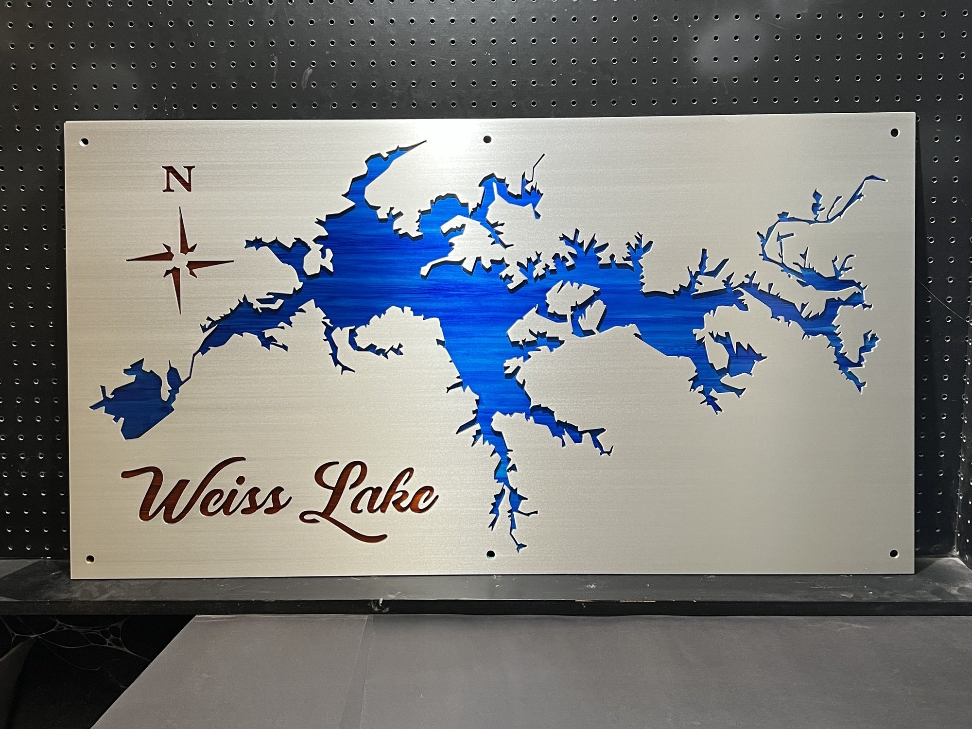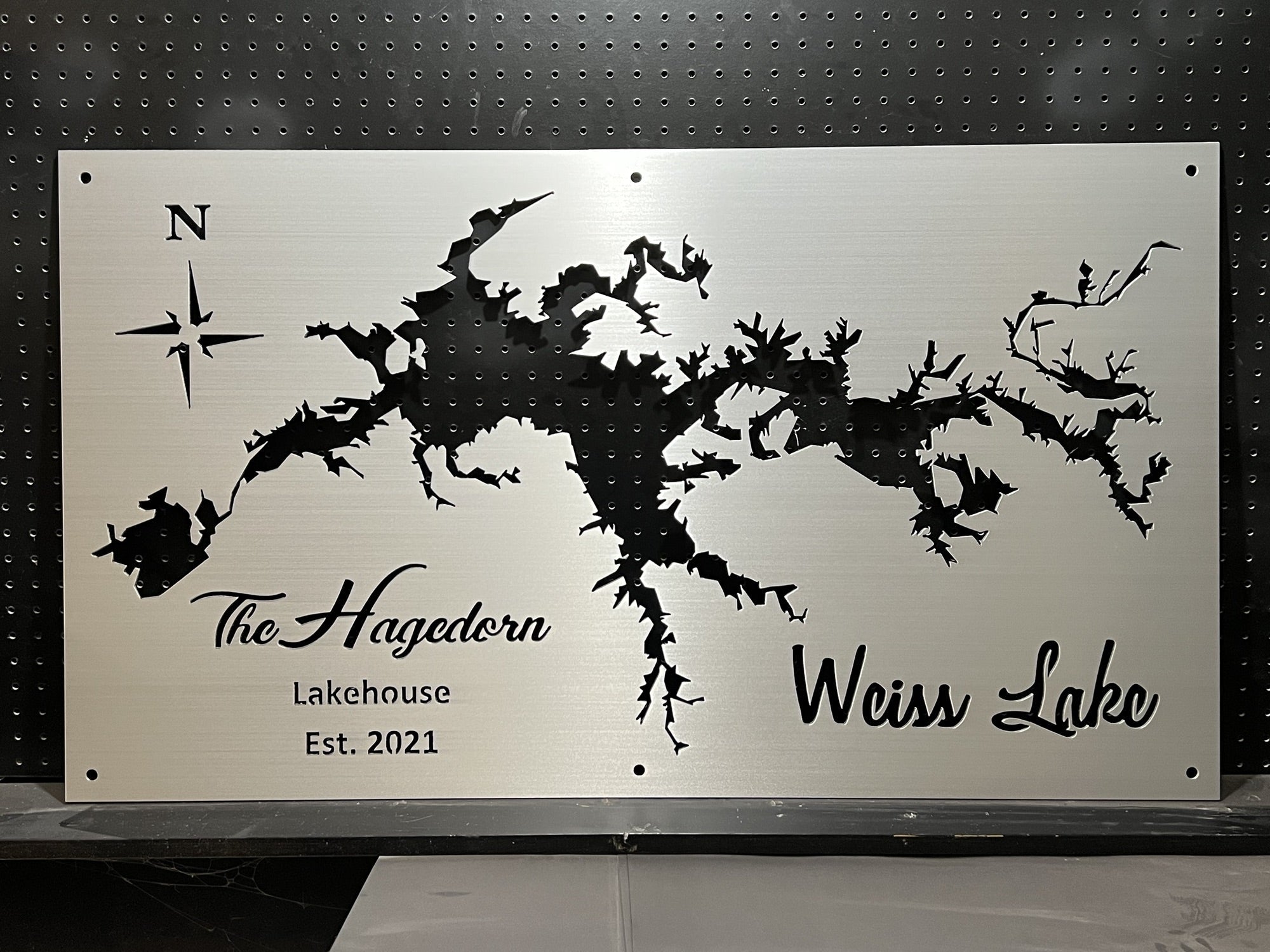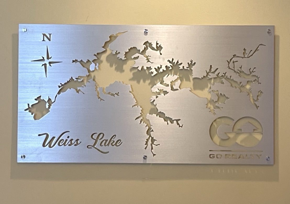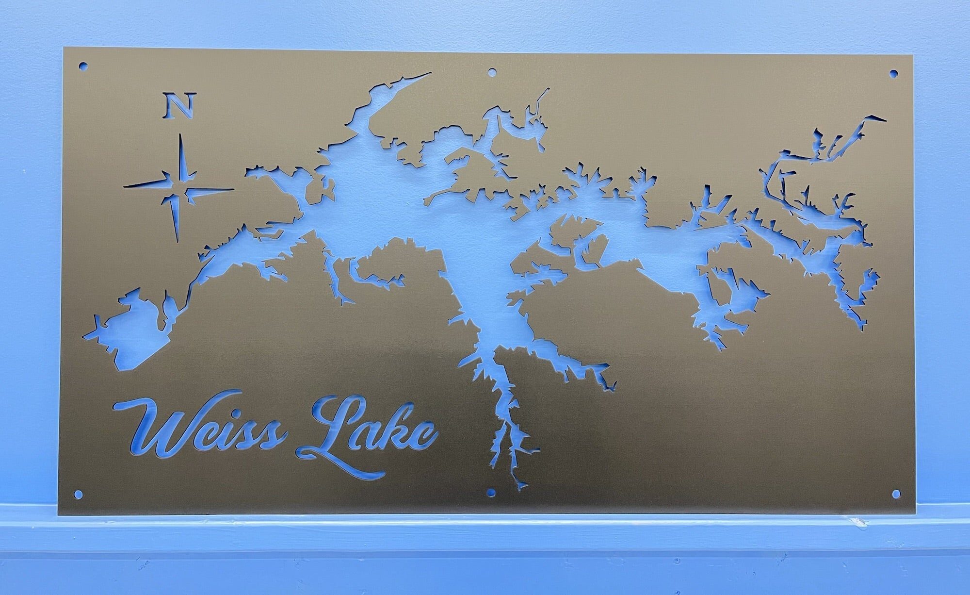 Make a unique statement with our beautifully crafted Weiss Lake map. Each Weiss Lake map is precision-cut from high-quality 1/8″ brushed aluminum, measuring 23″x43″. Mounted with 3/4-inch stainless-steel standoffs, your custom lake map appears to float elegantly off your wall, indoors or outdoors.
