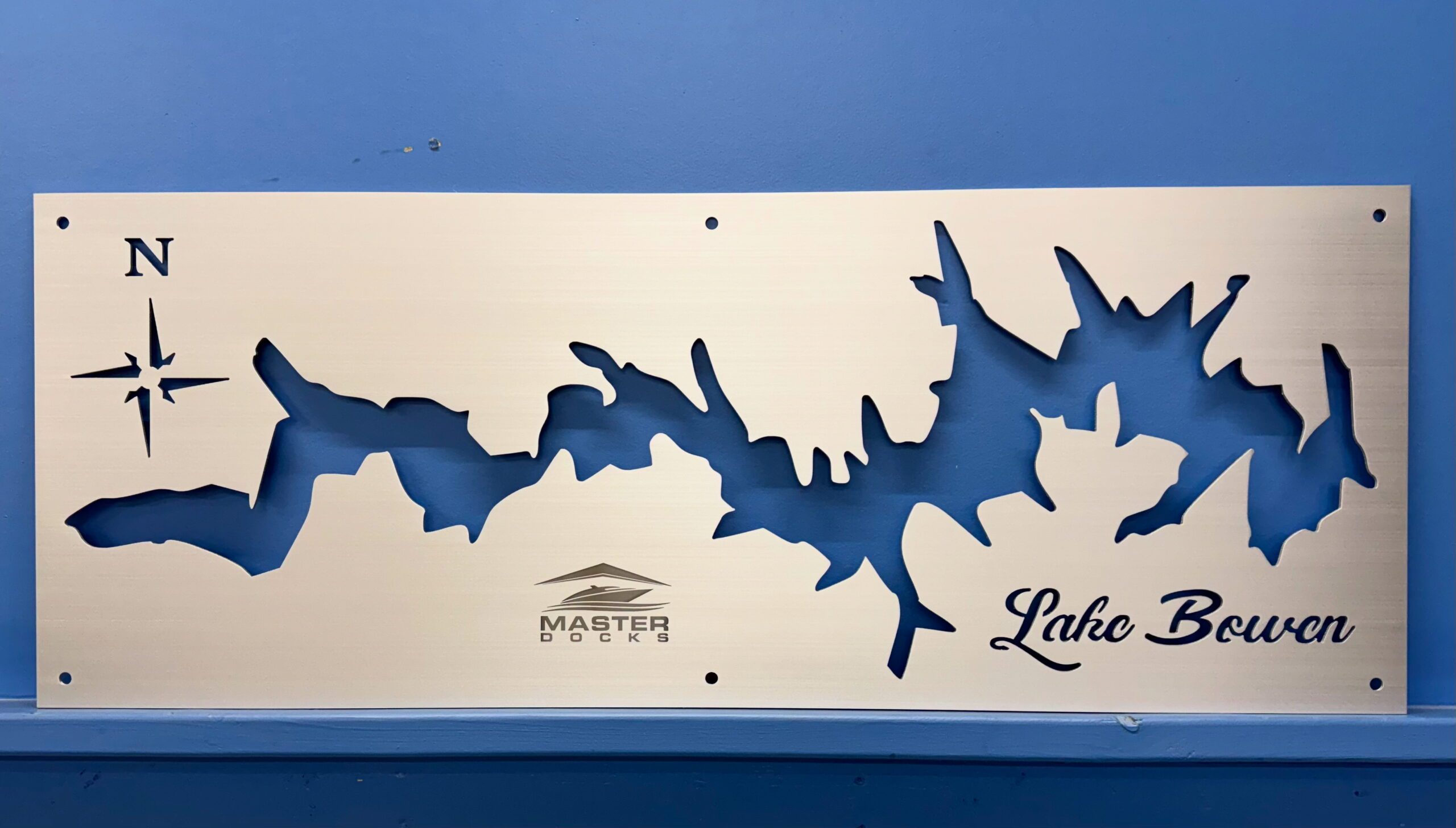 Each Lake Bowen map starts with a single 1/8″ sheet of American-made aluminum. We hand-brush the surface, seal it with a marine-grade clear coat, and float-mount the finished piece ¾″ off the wall for elegant shadow lines.